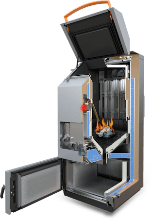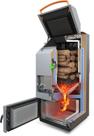 Unikátní zplynovací kotel na dřevo s odtahovým ventilátorem a řídící jednotkou pro regulaci výkonu