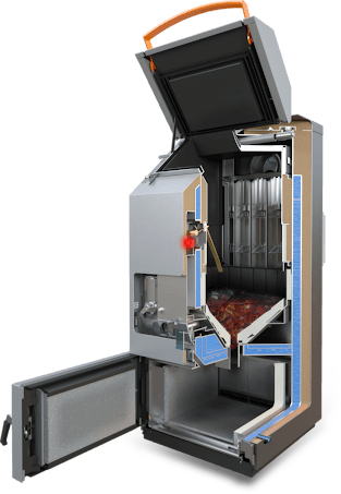 Přiložení - po přiložení paliva v celém objemu přikládací komory je doba hoření až 8 hodin v závislosti na typu paliva a zvoleném výkonu kotle.